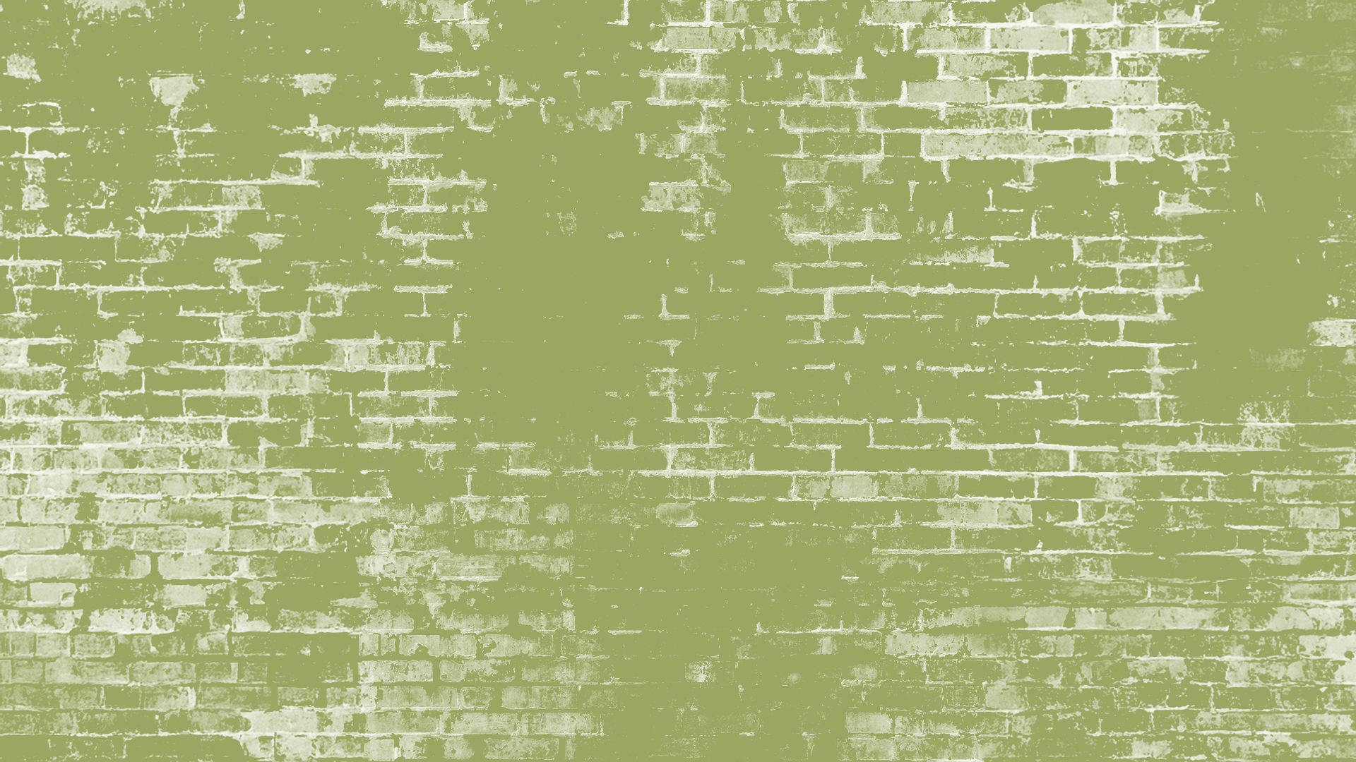 A brick wall that appears to have been painted over with a muted, olive green color, with the paint wearing off in some areas revealing the original brick surface.
